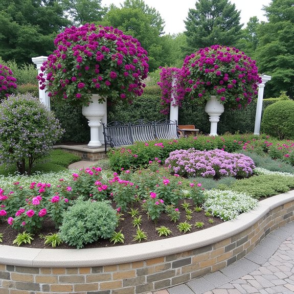 When planning purple rose garden displays, gardeners can create stunning visual impact through strategic color combinations and thoughtful placement. Design inspirations include pairing compact varieties like Easy on the Eyes (2-3 feet) with taller Quicksilver climbers (5-7 feet) for layered depth. White or cream companions enhance purple blooms beautifully, while silver foliage plants complement mauve tones perfectly. Consider clustering three to five plants of the same variety for maximum color impact. Mass plantings of Lavender Dream or Twilight Zone create dramatic focal points in borders. These thoughtful color combinations transform ordinary gardens into spectacular purple showcases.