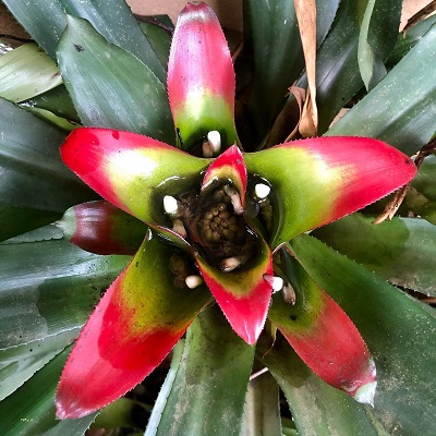 Neoregelias have broad, flat leaves marked brightly with red, purple, or yellow pigments, and they bloom only once in their lifetime. There are about 90 species of Neoregelia that grow wild in South American rainforests, and there are hundreds of hybrids with an amazing variety of sizes, forms, and colors.