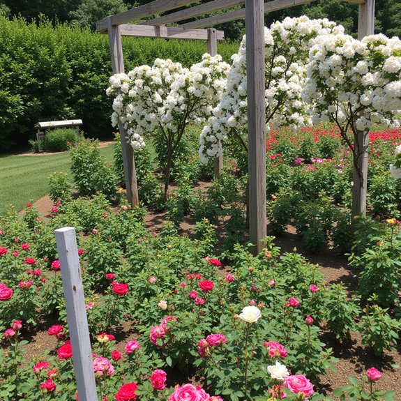 Now that you’ve selected show-stopping varieties with unique colors, you’ll need to arrange them strategically to create stunning visual combinations throughout your garden space. Start by grouping roses with similar heights together, maintaining 3-4 feet plant spacing for proper air circulation and growth.