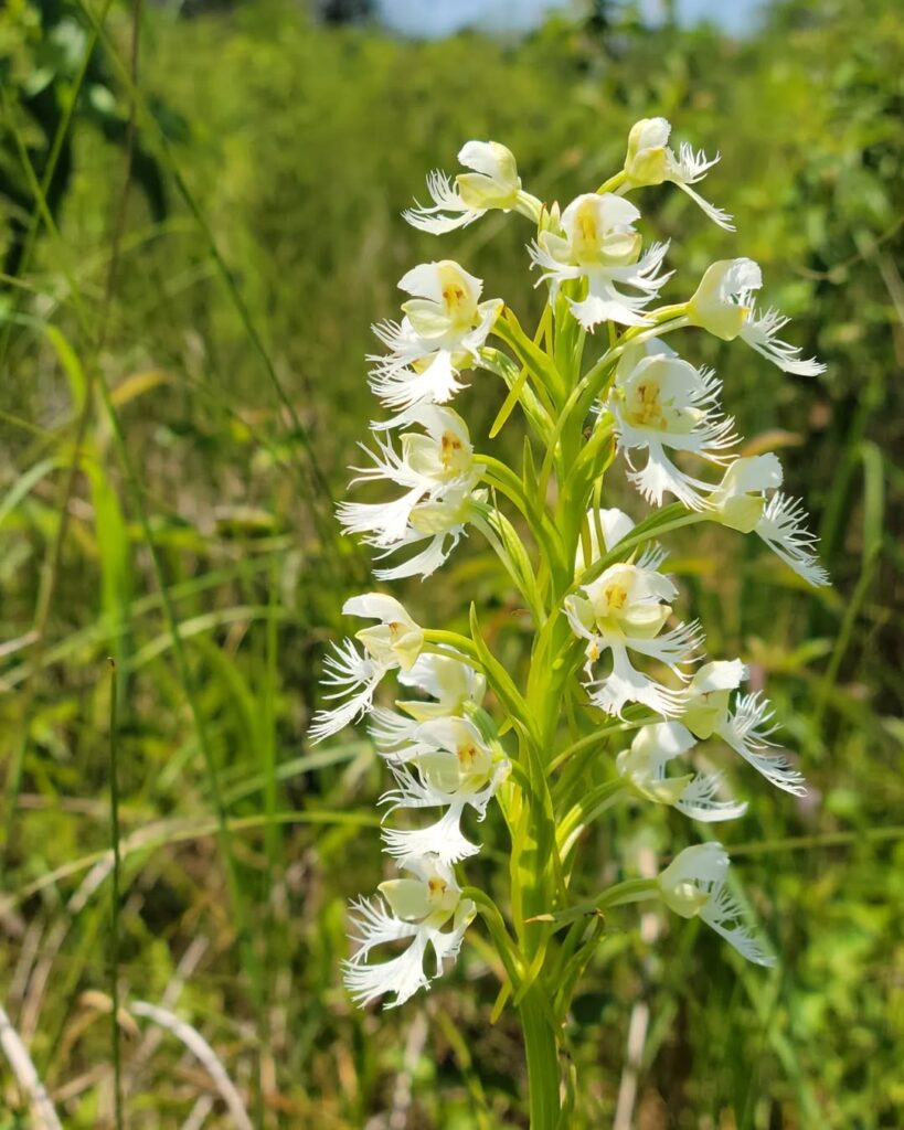 A tall orchid with fringed, spidery white blooms that thrive in grassy landscapes.